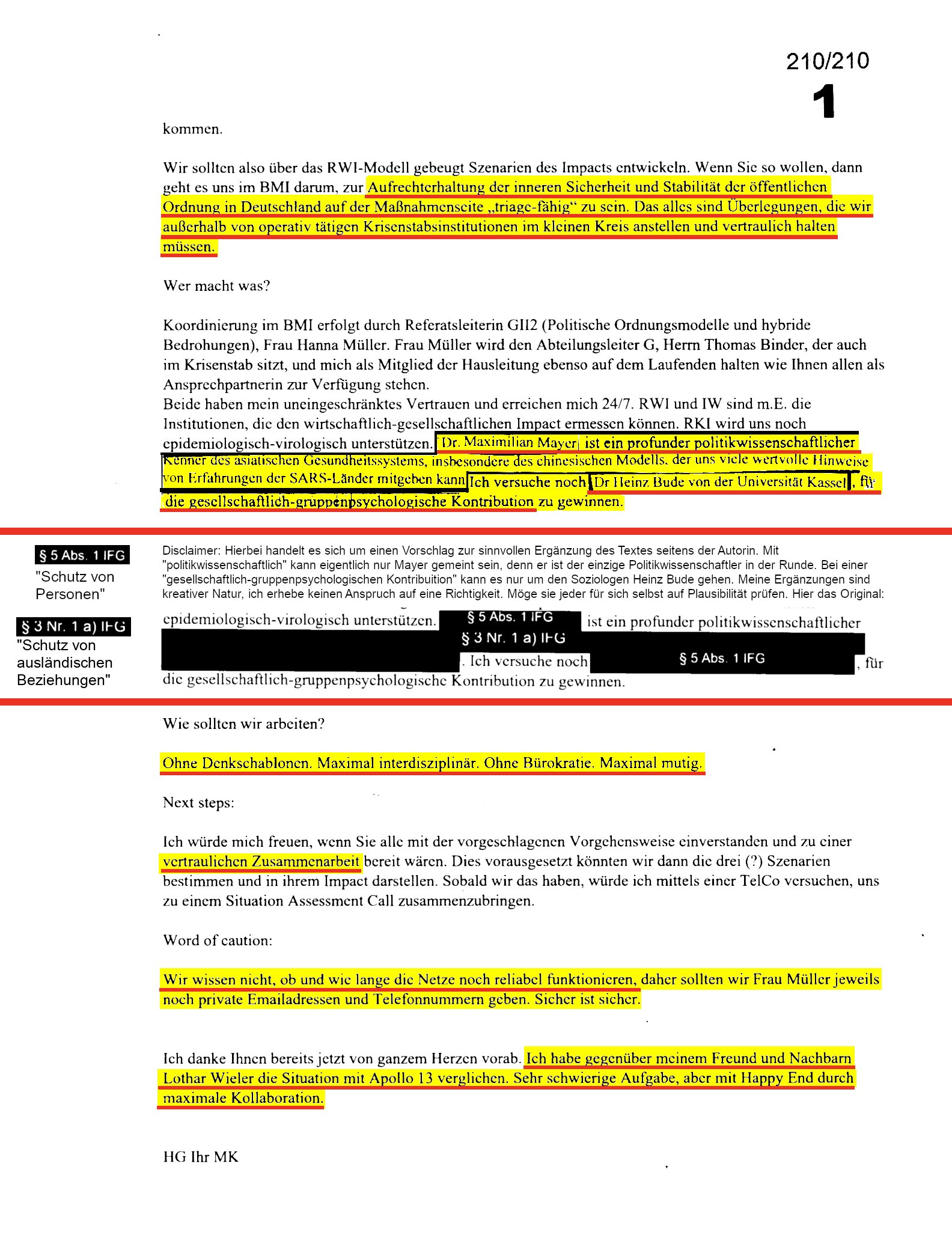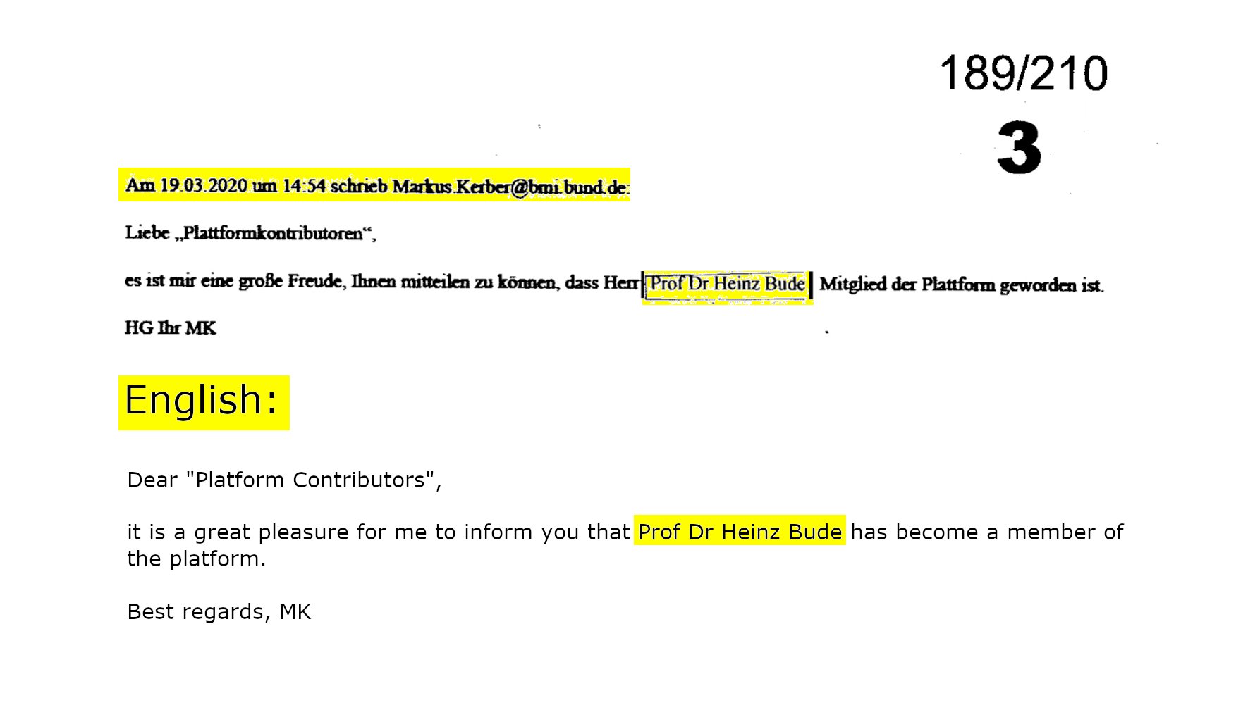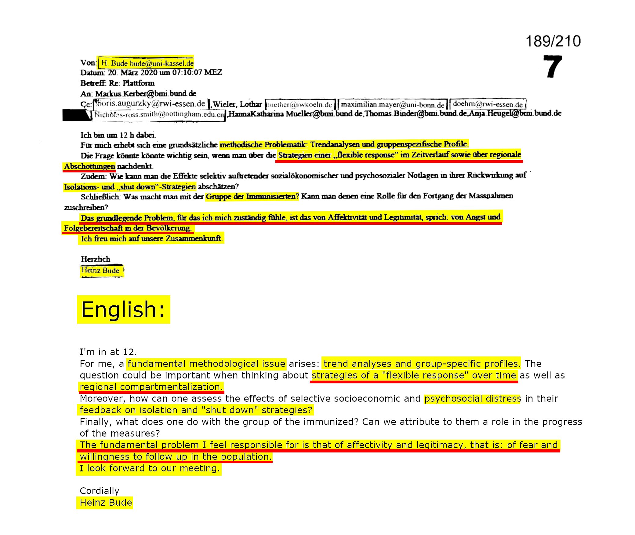 37/210: EMAIL 6) ist identisch mit 4). EMAIL 7) Ich vermute hier den Soziologen Heinz Bude: "Trendanalysen, gruppenspezifische Profile, Gruppe der Immunisierten" klingt nach #Soziologensprech. Auf Budes Rolle in der @BMI_Bund-Taskforce bietet seine Medienarbeit Rückschlüsse: