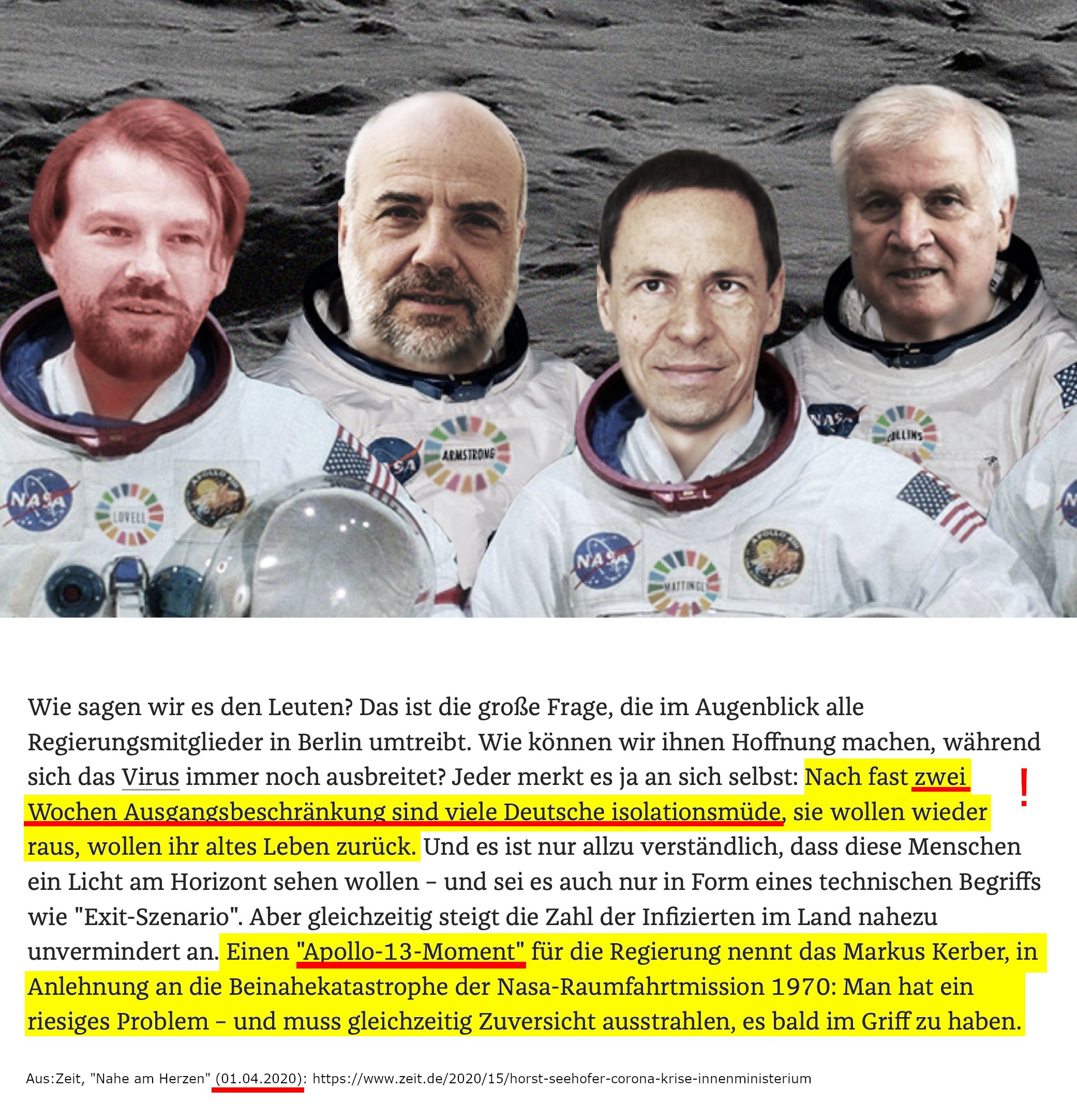 22/210: Fast rührend erscheint angesichts dessen Markus Kerbers Apollo 13-Metapher: „Ich habe gegenüber meinem Freund und Nachbarn Lothar Wieler die Aufgabe mit der Apollo 13 verglichen. Sehr schwierige Aufgabe, aber mit Happy End durch maximale Kooperation“.