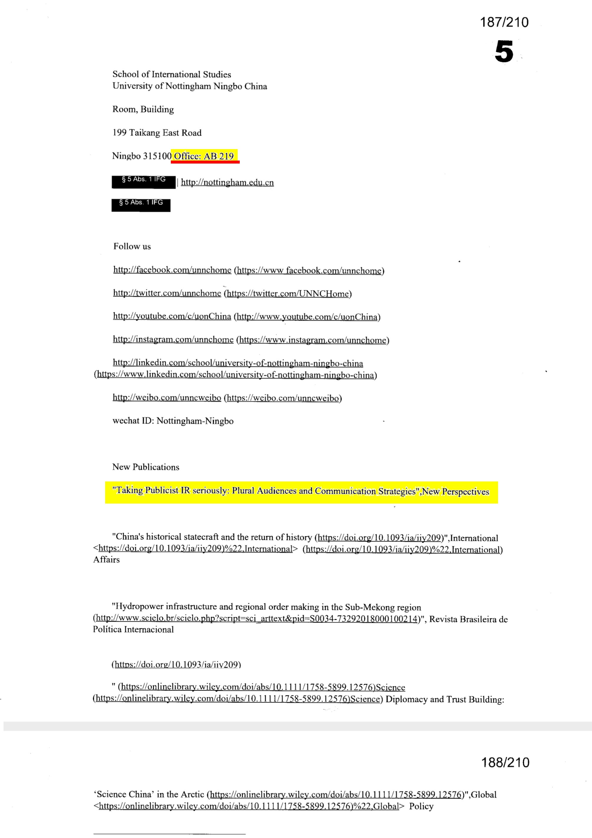 31/210: EMAIL 5) Die fünfte Email kommt aus einem Büro der University of Nottingham Ningbo China @UNNCHome. Es ist sogar eine Büronummer angeben, Office AB 219. Für @mayer_iras' Emailadresse ist das Feld etwas zu lang, außerdem befand er sich zu diesem Zeitpunkt wieder in Bonn.