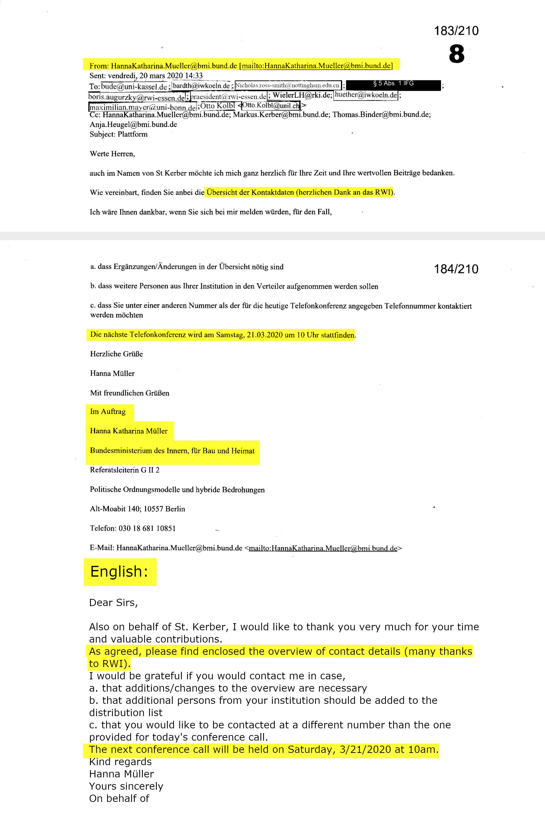 41/210: EMAIL 8) Hanna Katharina Müller, die Leiterin des @BMI_Bund-Referats GII2 "Politische Ordnungsmodelle und hybride Bedrohungen", dankt allen im Namen von Herrn Kerber, verschickt eine Liste mit Kontaktdaten und kündigt die nächste Videokonferenz am Samstag um 10 Uhr an.