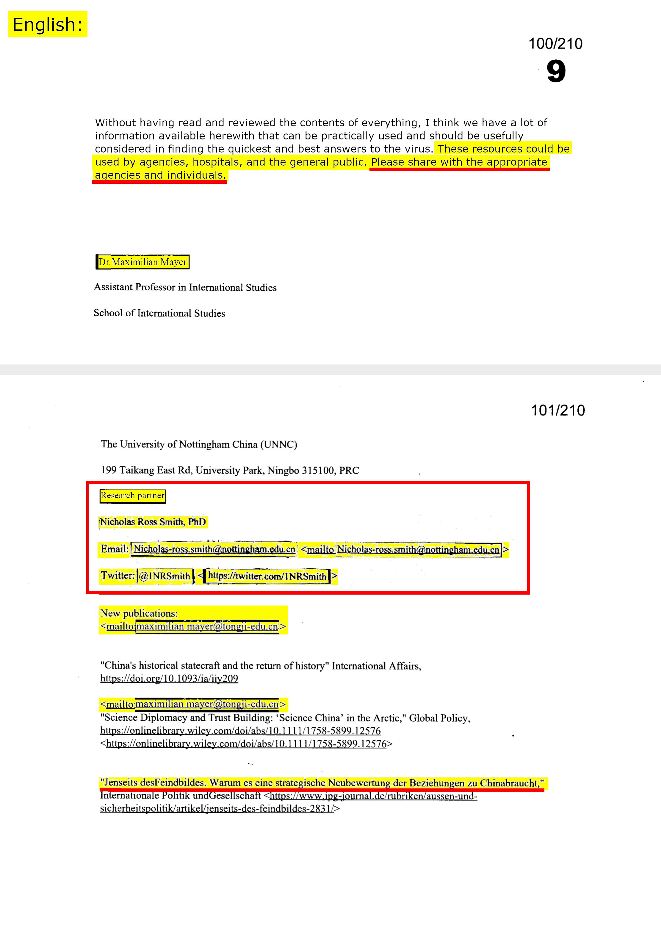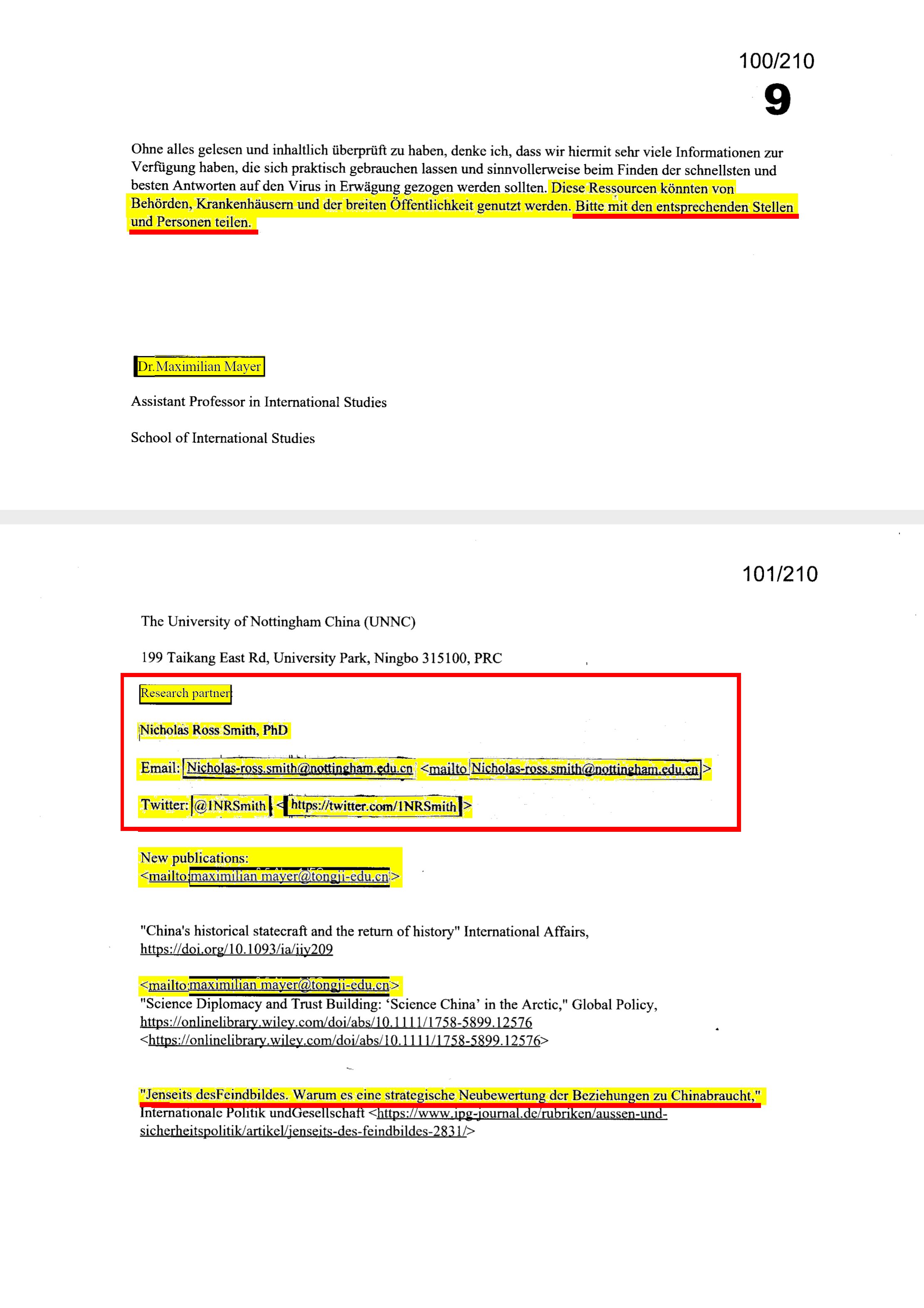 25/210: EMAIL 2) @mayer_iras betritt die Taskforce-Bühne. Er stellt die ContainCovid-19 Taskforce vor, ein Team der University of Nottingham Ningbo China @UNNCHome, das einen „interdisziplinären Zugang zur Seucheneindämmung & Kontext-gesättigtes Wissen über Asien“ anbieten könne.