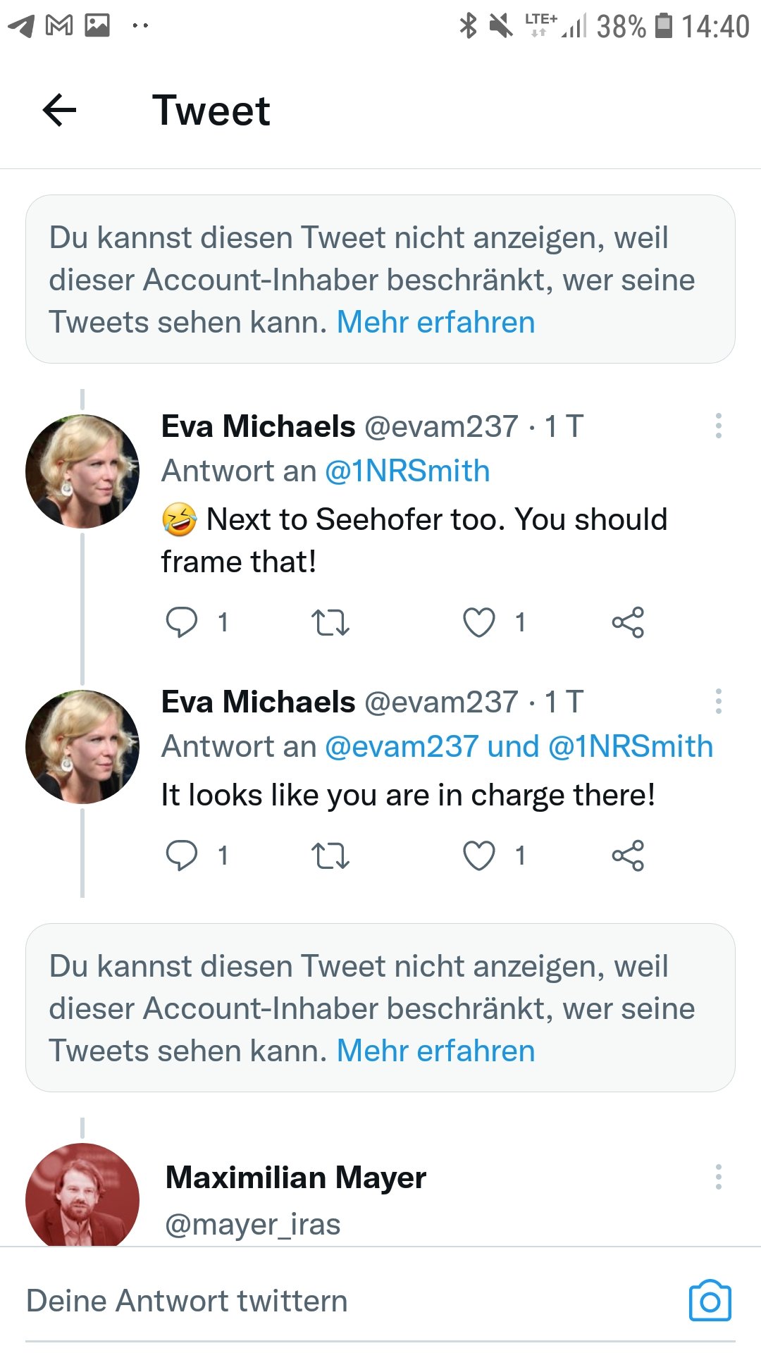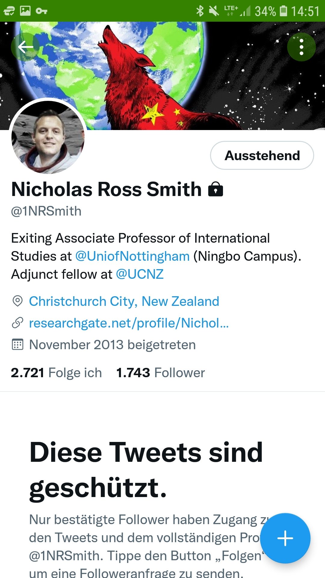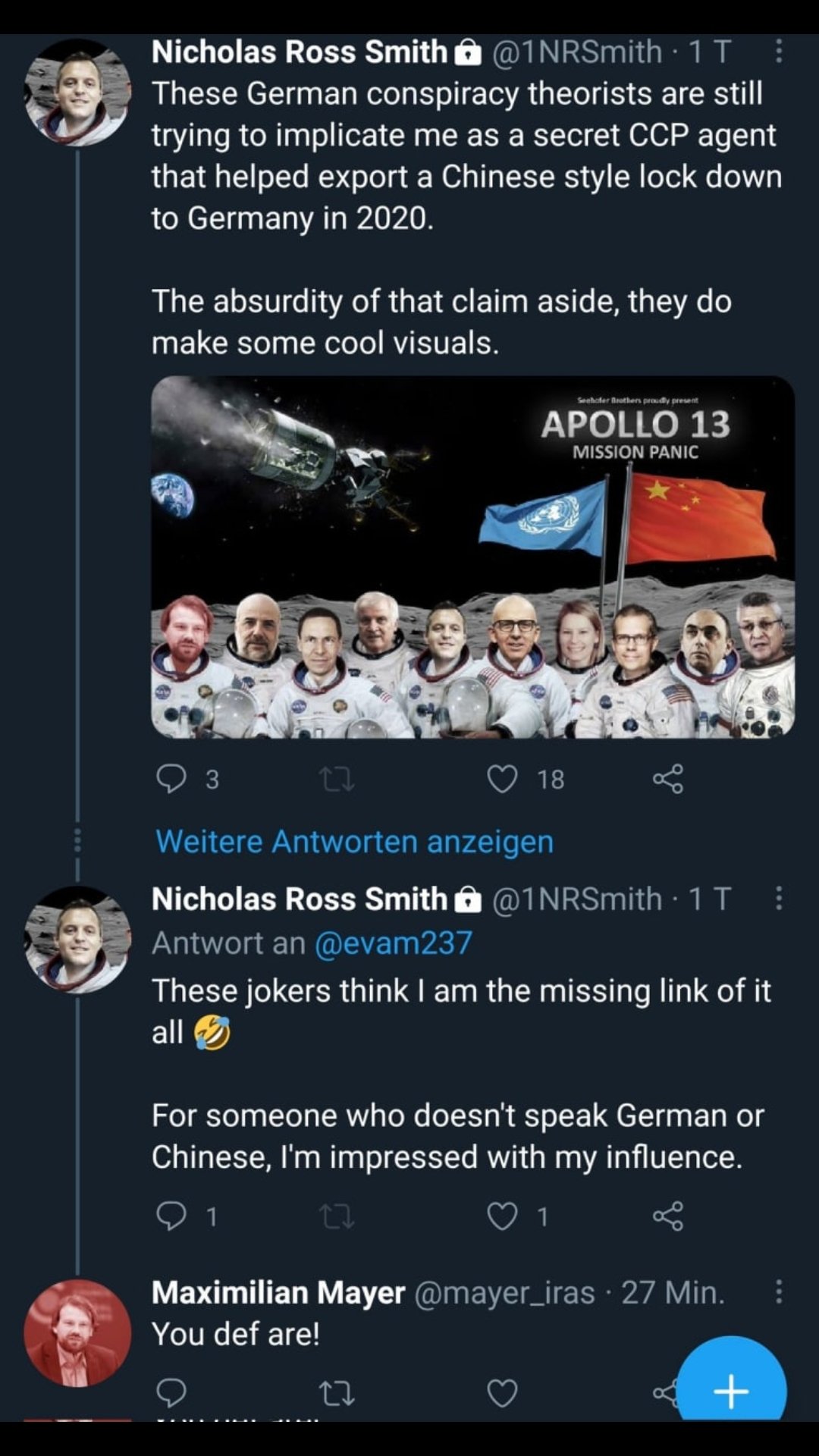 Addendum 1) @1NRSmith hat sein Profil seit meinem Thread auf "privat" gestellt, niemand kann seine Tweets & Followerlisten mehr sehen. Mich muss er sogar blockiert haben, denn ich bin ihm vorher gefolgt. Sein Bild im Apollo 13 Kostüm hat ihm aber gefallen.