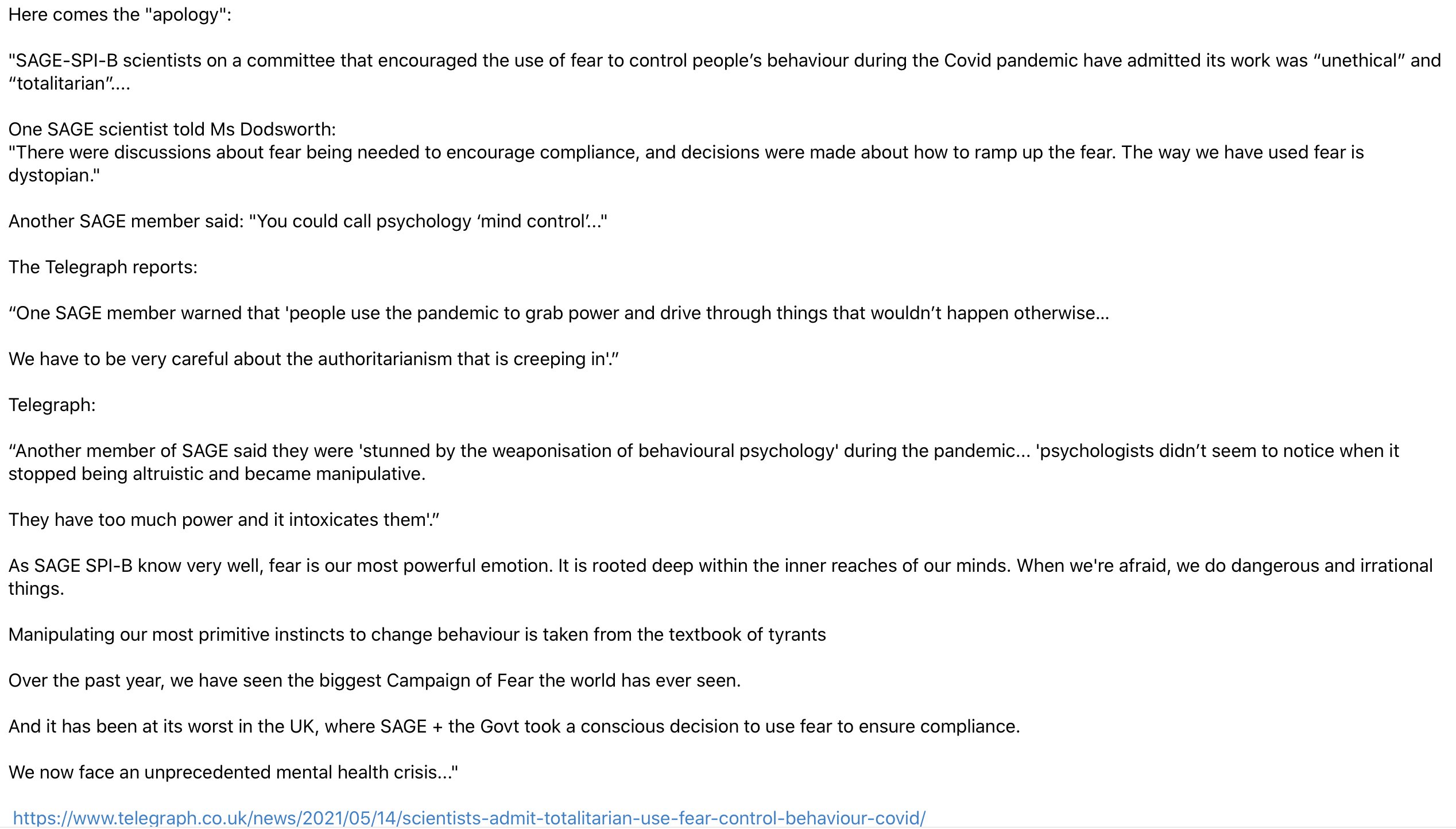 174/210: Urheber war die inzwischen berüchtigte „Scientific Pandemic Influenza Group on Behaviours" (SPI-B), die ein Gutachten für „Scientific Advisory Group for Emergencies" (Sage) erstellte. Psychologen reichten nun dagegen @BPSOfficial Beschwerde ein. archive.is/nJ14Y