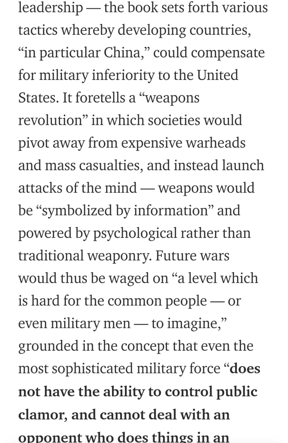 187/210: An dieser Stelle sei auf ein „chinesisches Strategiepapier“ verwiesen: „Unrestricted Warfare“ (1991), ein Militärhandbuch zweier Ex PLA-Luftwaffenoffiziere. Es beschreibt Strategien psychologischer Kriegsführung, "Weapons of the Mind" bit.ly/3wnHMfN @StaceyRudin